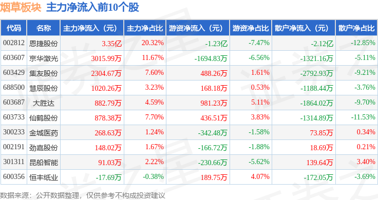 从资金流向上来看,当日烟草板块主力资金净流入3.25亿元,游资资金净流出1.54亿元,散户资金净流出1.71亿元。烟草板块个股资金流向见下表: