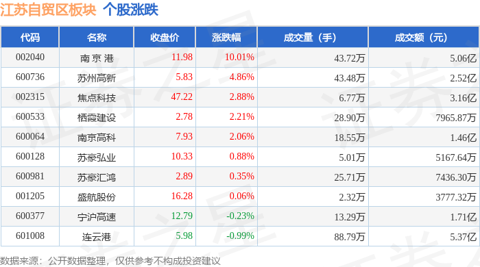 证券之星消息,9月24日江苏自贸区板块较上一交易日上涨2.4%,南 京 港领涨。当日上证指数报收于3853.64,上涨0.83%。深证成指报收于13356.14,上涨1.8%。江苏自贸区板块个股涨跌见下表: