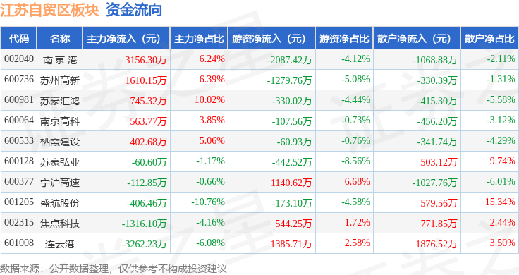从资金流向上来看,当日江苏自贸区板块主力资金净流入1319.97万元,游资资金净流出1410.75万元,散户资金净流入90.78万元。江苏自贸区板块个股资金流向见下表: