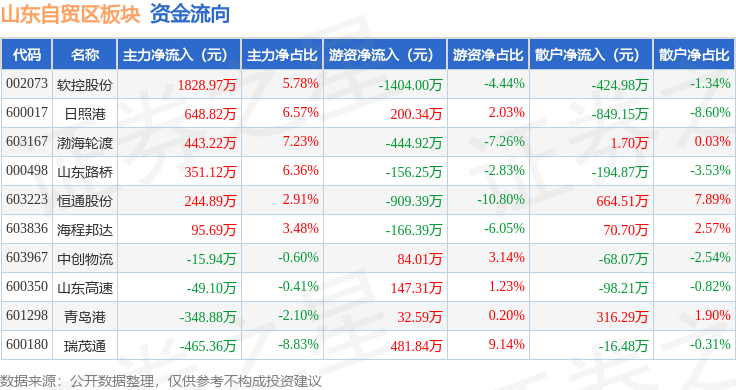 从资金流向上来看,当日山东自贸区板块主力资金净流入2733.43万元,游资资金净流出2134.86万元,散户资金净流出598.57万元。山东自贸区板块个股资金流向见下表: