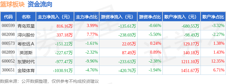 从资金流向上来看,当日篮球板块主力资金净流出1233.92万元,游资资金净流出919.16万元,散户资金净流入2153.08万元。篮球板块个股资金流向见下表: