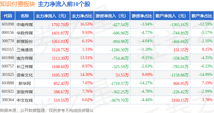从资金流向上来看,当日知识付费板块主力资金净流出2.1亿元,游资资金净流出1.04亿元,散户资金净流入3.13亿元。知识付费板块个股资金流向见下表: