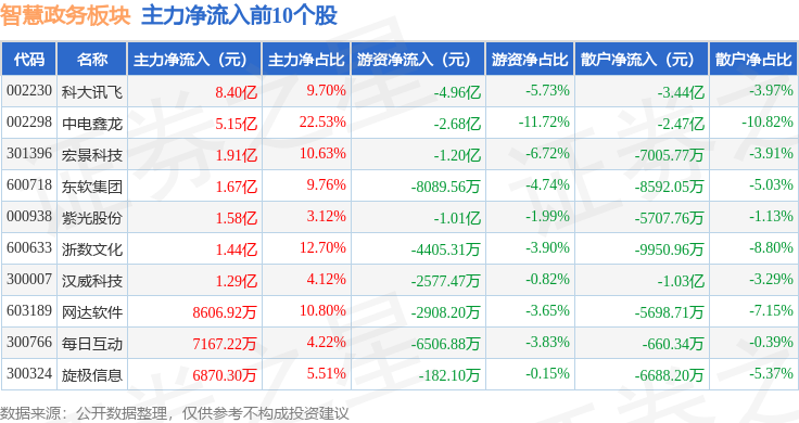 从资金流向上来看,当日智慧政务板块主力资金净流入11.14亿元,游资资金净流出22.54亿元,散户资金净流入11.4亿元。智慧政务板块个股资金流向见下表: