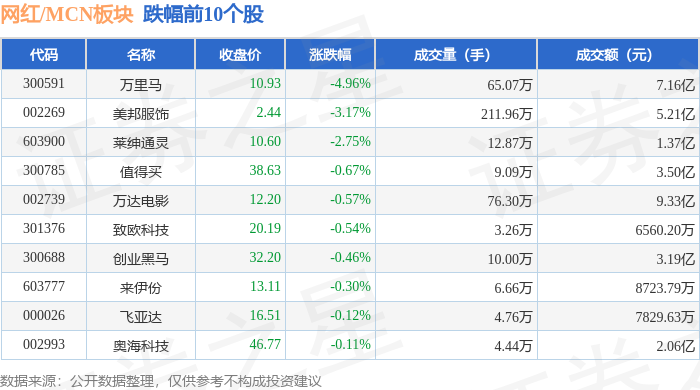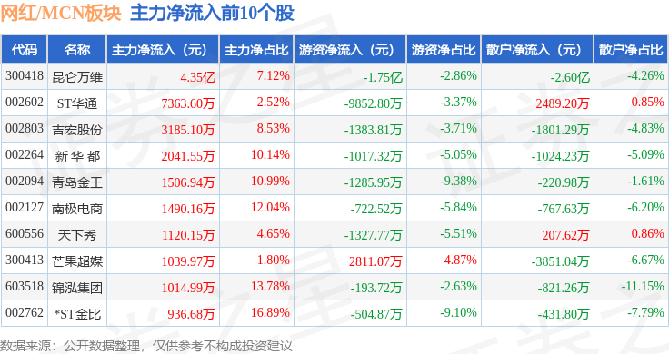 从资金流向上来看,当日网红/MCN板块主力资金净流出5.29亿元,游资资金净流出1.34亿元,散户资金净流入6.62亿元。网红/MCN板块个股资金流向见下表: