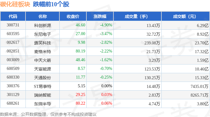 从资金流向上来看,当日碳化硅板块主力资金净流入33.61亿元,游资资金净流出25.7亿元,散户资金净流出7.9亿元。碳化硅板块个股资金流向见下表: