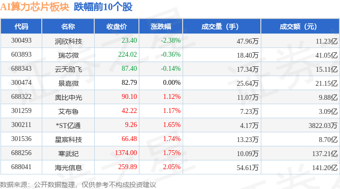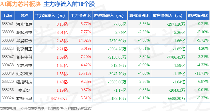 从资金流向上来看,当日AI算力芯片板块主力资金净流入26.56亿元,游资资金净流出14.83亿元,散户资金净流出11.74亿元。AI算力芯片板块个股资金流向见下表: