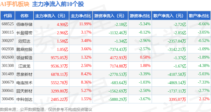 从资金流向上来看,当日AI手机板块主力资金净流入7.91亿元,游资资金净流出4.96亿元,散户资金净流出2.96亿元。AI手机板块个股资金流向见下表: