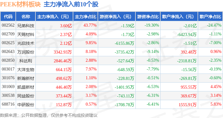 从资金流向上来看,当日PEEK材料板块主力资金净流入3.76亿元,游资资金净流出5.53亿元,散户资金净流入1.77亿元。PEEK材料板块个股资金流向见下表: