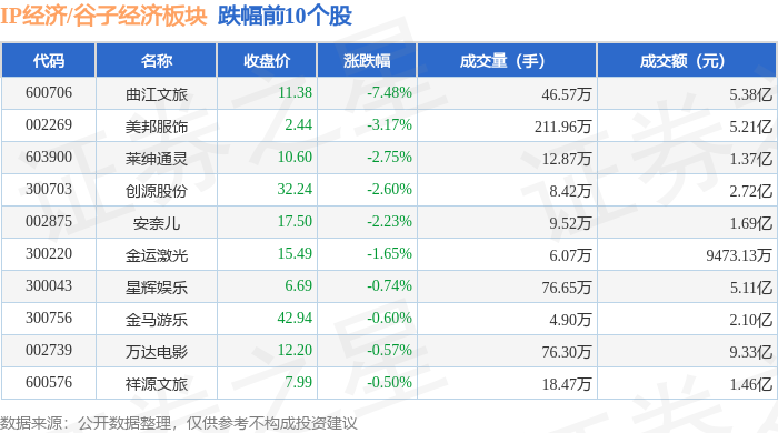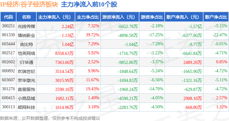 从资金流向上来看,当日IP经济/谷子经济板块主力资金净流入1.38亿元,游资资金净流出6.0亿元,散户资金净流入4.61亿元。IP经济/谷子经济板块个股资金流向见下表: