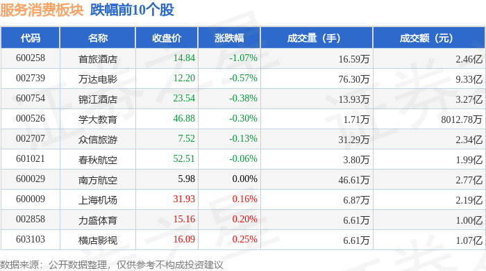 证券之星消息,9月24日服务消费板块较上一交易日下跌1.26%,首旅酒店领跌。当日上证指数报收于3853.64,上涨0.83%。深证成指报收于13356.14,上涨1.8%。服务消费板块个股涨跌见下表: