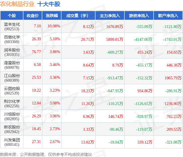 个股表现方面,农化制品行业当日领涨股为蓝丰生化(002513),该股当日报收7.1,上涨10.08%,成交量8.12万,主力资金净流入1676.89万元。百傲化学(603360)以上涨5.1%紧随其后,该股当日成交量20.71万,主力资金净流入5890.01万元。除此之外,润丰股份(301035)、澄星股份(600078)、江山股份(600389)均进入当日牛股之列。具体个股列表见下表: