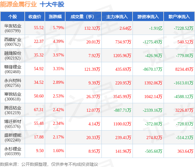 个股表现方面,能源金属行业当日领涨股为华友钴业(603799),该股当日报收55.52,上涨5.79%,成交量132.32万,主力资金净流入2.64亿元。西藏矿业(000762)以上涨4.39%紧随其后,该股当日成交量20.01万,主力资金净流入734.97万元。除此之外,融捷股份(002192)、赣锋锂业(002460)、永兴材料(002756)均进入当日牛股之列。具体个股列表见下表: