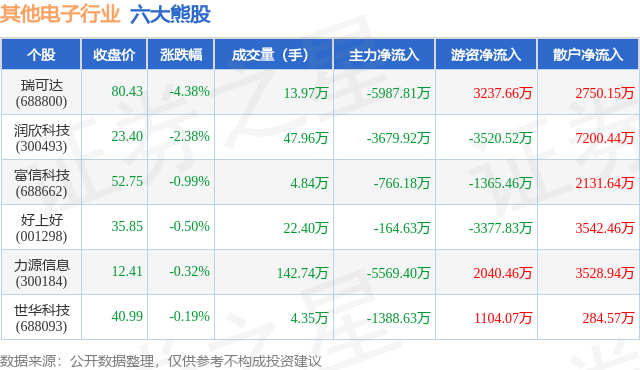个股表现方面,其他电子行业当日领跌股为瑞可达(688800),该股当日报收80.43,下跌4.38%,成交量13.97万,主力资金净流出5987.81万元。润欣科技(300493)以下跌2.38%紧随其后,该股当日成交量47.96万,主力资金净流出3679.92万元。除此之外,富信科技(688662)、好上好(001298)、力源信息(300184)均进入当日熊股之列。具体个股列表见下表: