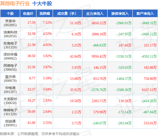 个股表现方面,其他电子行业当日领涨股为京泉华(002885),该股当日报收17.59,上涨7.52%,成交量51.1万,主力资金净流入6816.22万元。洁美科技(002859)以上涨4.52%紧随其后,该股当日成交量6.1万,主力资金净流入2008.18万元。除此之外,东南电子(301359)、深圳华强(000062)、民德电子(300656)均进入当日牛股之列。具体个股列表见下表: