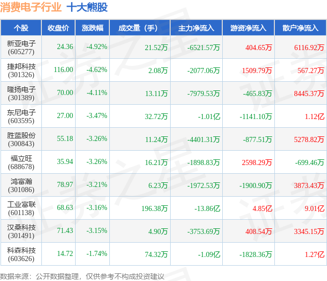 个股表现方面,消费电子行业当日领跌股为新亚电子(605277),该股当日报收24.36,下跌4.92%,成交量21.52万,主力资金净流出6521.57万元。捷邦科技(301326)以下跌4.62%紧随其后,该股当日成交量2.08万,主力资金净流出2077.06万元。除此之外,隆扬电子(301389)、东尼电子(603595)、胜蓝股份(300843)均进入当日熊股之列。具体个股列表见下表: