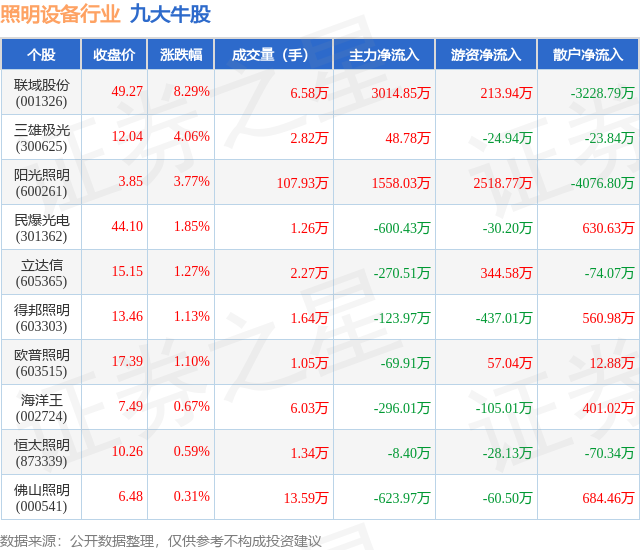 个股表现方面,照明设备行业当日领涨股为联域股份(001326),该股当日报收49.27,上涨8.29%,成交量6.58万,主力资金净流入3014.85万元。三雄极光(300625)以上涨4.06%紧随其后,该股当日成交量2.82万,主力资金净流入48.78万元。除此之外,阳光照明(600261)、民爆光电(301362)、立达信(605365)均进入当日牛股之列。具体个股列表见下表: