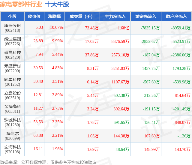 个股表现方面,家电零部件行业当日领涨股为康盛股份(002418),该股当日报收5.03,上涨10.07%,成交量73.48万,主力资金净流入1.68亿元。朗迪集团(603726)以上涨9.99%紧随其后,该股当日成交量17.02万,主力资金净流入8376.59万元。除此之外,毅昌科技(002420)、禾盛新材(002290)、同星科技(301252)均进入当日牛股之列。具体个股列表见下表: