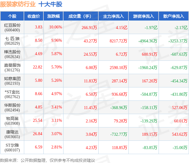 个股表现方面,服装家纺行业当日领涨股为红豆股份(600400),该股当日报收3.83,上涨10.06%,成交量266.91万,主力资金净流入4.15亿元。七 匹 狼(002029)以上涨9.96%紧随其后,该股当日成交量43.27万,主力资金净流入8217.72万元。除此之外,棒杰股份(002634)、嘉曼服饰(301276)、如意集团(002193)均进入当日牛股之列。具体个股列表见下表: