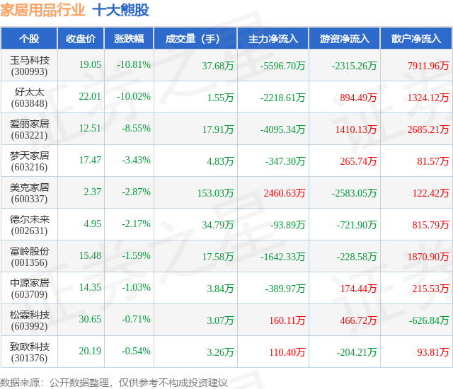 个股表现方面,家居用品行业当日领跌股为玉马科技(300993),该股当日报收19.05,下跌10.81%,成交量37.68万,主力资金净流出5596.7万元。好太太(603848)以下跌10.02%紧随其后,该股当日成交量1.55万,主力资金净流出2218.61万元。除此之外,爱丽家居(603221)、梦天家居(603216)、美克家居(600337)均进入当日熊股之列。具体个股列表见下表:
