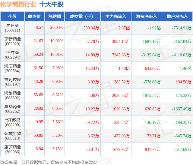 个股表现方面,化学制药行业当日领涨股为向日葵(300111),该股当日报收8.57,上涨20.03%,成交量300.34万,主力资金净流入2.67亿元。京新药业(002020)以上涨10.02%紧随其后,该股当日成交量27.78万,主力资金净流入3854.14万元。除此之外,信立泰(002294)、海辰药业(300584)、首药控股(688197)均进入当日牛股之列。具体个股列表见下表: