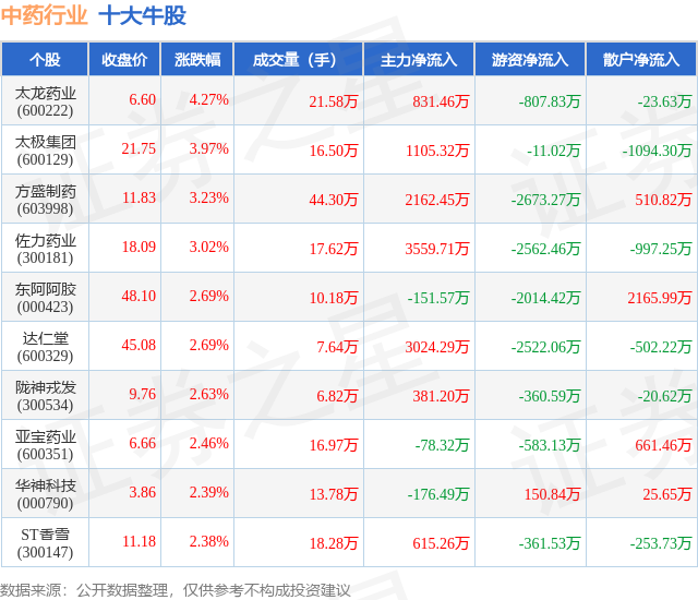 个股表现方面,中药行业当日领涨股为太龙药业(600222),该股当日报收6.6,上涨4.27%,成交量21.58万,主力资金净流入831.46万元。太极集团(600129)以上涨3.97%紧随其后,该股当日成交量16.5万,主力资金净流入1105.32万元。除此之外,方盛制药(603998)、佐力药业(300181)、东阿阿胶(000423)均进入当日牛股之列。具体个股列表见下表:
