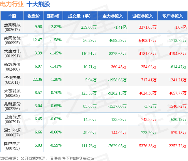 个股表现方面,电力行业当日领跌股为露笑科技(002617),该股当日报收9.98,下跌2.82%,成交量239.08万,主力资金净流出1.41亿元。南网储能(600995)以下跌1.58%紧随其后,该股当日成交量56.29万,主力资金净流出4689.39万元。除此之外,大唐发电(601991)、新筑股份(002480)、杭州热电(605011)均进入当日熊股之列。具体个股列表见下表: