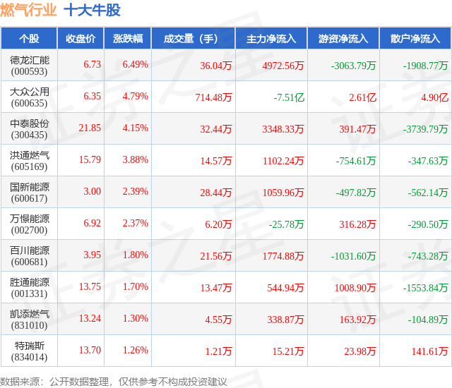 个股表现方面,燃气行业当日领涨股为德龙汇能(000593),该股当日报收6.73,上涨6.49%,成交量36.04万,主力资金净流入4972.56万元。大众公用(600635)以上涨4.79%紧随其后,该股当日成交量714.48万,主力资金净流出7.51亿元。除此之外,中泰股份(300435)、洪通燃气(605169)、国新能源(600617)均进入当日牛股之列。具体个股列表见下表: