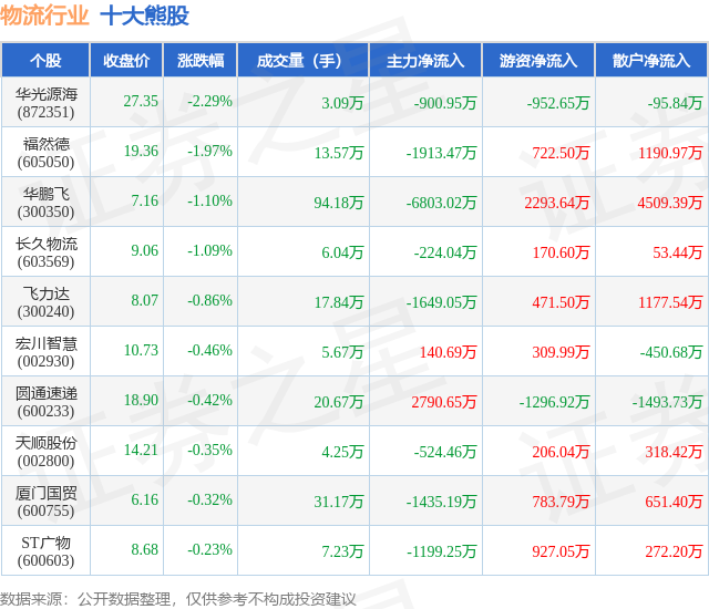 个股表现方面,物流行业当日领跌股为华光源海(872351),该股当日报收27.35,下跌2.29%,成交量3.09万,主力资金净流出900.95万元。福然德(605050)以下跌1.97%紧随其后,该股当日成交量13.57万,主力资金净流出1913.47万元。除此之外,华鹏飞(300350)、长久物流(603569)、飞力达(300240)均进入当日熊股之列。具体个股列表见下表: