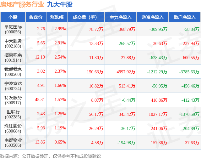 个股表现方面,房地产服务行业当日领涨股为皇庭国际(000056),该股当日报收2.76,上涨2.99%,成交量78.77万,主力资金净流入368.79万元。中天服务(002188)以上涨2.91%紧随其后,该股当日成交量13.33万,主力资金净流出268.57万元。除此之外,招商积余(001914)、我爱我家(000560)、宁波富达(600724)均进入当日牛股之列。具体个股列表见下表: