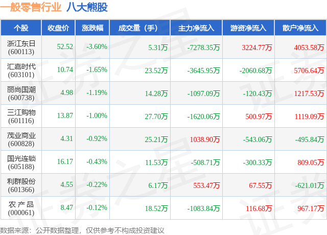 个股表现方面,一般零售行业当日领跌股为浙江东日(600113),该股当日报收52.52,下跌3.6%,成交量5.31万,主力资金净流出7278.35万元。汇嘉时代(603101)以下跌1.65%紧随其后,该股当日成交量23.52万,主力资金净流出3645.95万元。除此之外,丽尚国潮(600738)、三江购物(601116)、茂业商业(600828)均进入当日熊股之列。具体个股列表见下表: