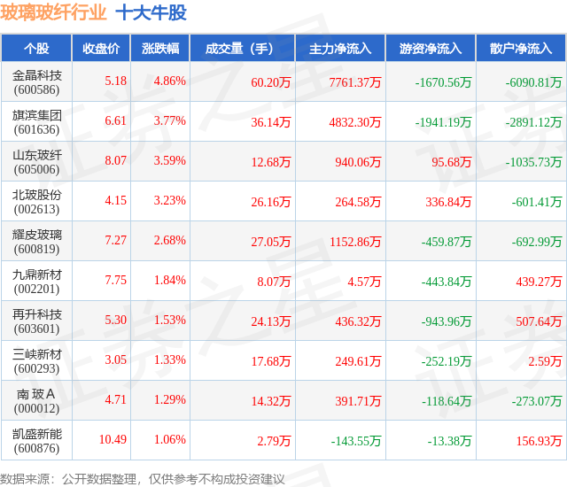 个股表现方面,玻璃玻纤行业当日领涨股为金晶科技(600586),该股当日报收5.18,上涨4.86%,成交量60.2万,主力资金净流入7761.37万元。旗滨集团(601636)以上涨3.77%紧随其后,该股当日成交量36.14万,主力资金净流入4832.3万元。除此之外,山东玻纤(605006)、北玻股份(002613)、耀皮玻璃(600819)均进入当日牛股之列。具体个股列表见下表: