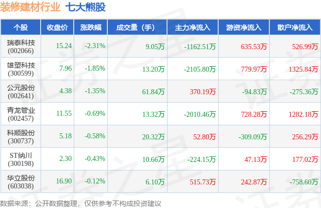 个股表现方面,装修建材行业当日领跌股为瑞泰科技(002066),该股当日报收15.24,下跌2.31%,成交量9.05万,主力资金净流出1162.51万元。雄塑科技(300599)以下跌1.85%紧随其后,该股当日成交量13.2万,主力资金净流出2105.8万元。除此之外,公元股份(002641)、青龙管业(002457)、科顺股份(300737)均进入当日熊股之列。具体个股列表见下表:
