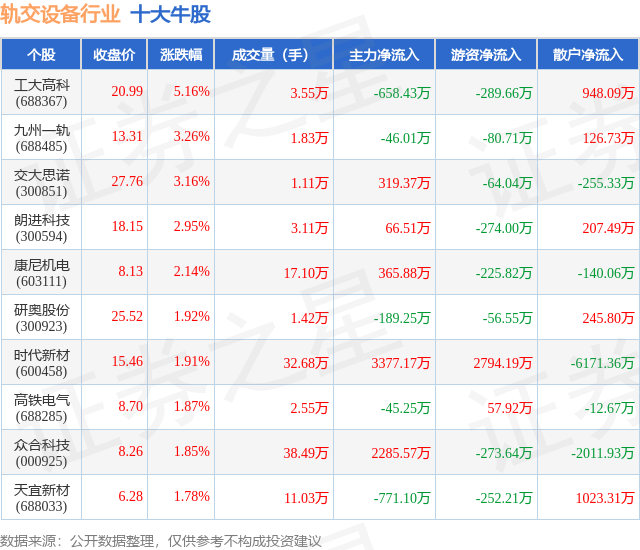 个股表现方面,轨交设备行业当日领涨股为工大高科(688367),该股当日报收20.99,上涨5.16%,成交量3.55万,主力资金净流出658.43万元。九州一轨(688485)以上涨3.26%紧随其后,该股当日成交量1.83万,主力资金净流出46.01万元。除此之外,交大思诺(300851)、朗进科技(300594)、康尼机电(603111)均进入当日牛股之列。具体个股列表见下表: