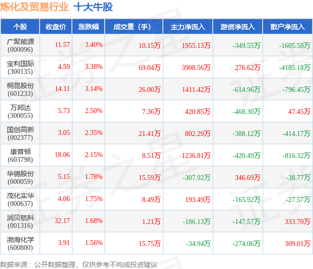 个股表现方面,炼化及贸易行业当日领涨股为广聚能源(000096),该股当日报收11.57,上涨3.4%,成交量10.15万,主力资金净流入1955.13万元。宝利国际(300135)以上涨3.38%紧随其后,该股当日成交量69.04万,主力资金净流入3908.56万元。除此之外,桐昆股份(601233)、万邦达(300055)、国创高新(002377)均进入当日牛股之列。具体个股列表见下表: