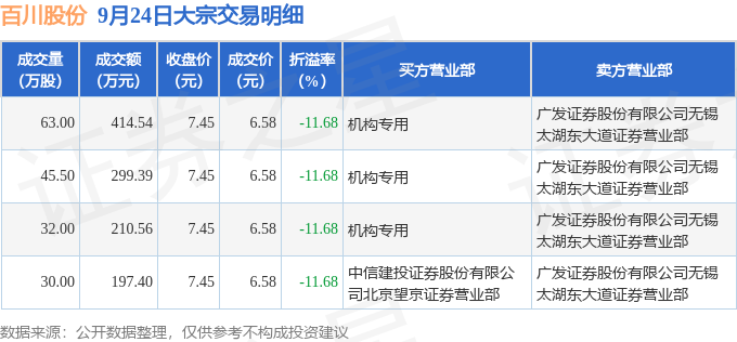 证券之星消息,9月24日百川股份发生大宗交易,交易数据如下: