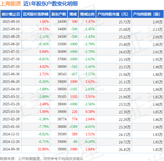 从股价来看,2025年9月10日至2025年9月19日,上海能源区间涨幅为1.66%,在此期间股东户数增加500.0户,增幅为1.47%。