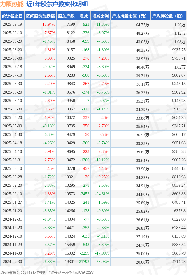 从股价来看,2025年9月10日至2025年9月19日,力聚热能区间涨幅为18.94%,在此期间股东户数减少923.0户,减幅为11.36%。