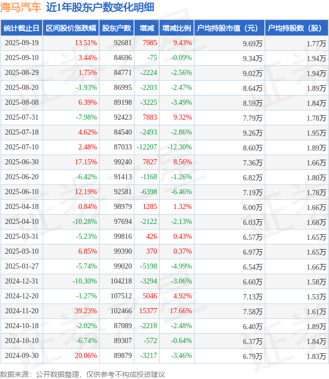 从股价来看,2025年9月10日至2025年9月19日,海马汽车区间涨幅为13.51%,在此期间股东户数增加7985.0户,增幅为9.43%。