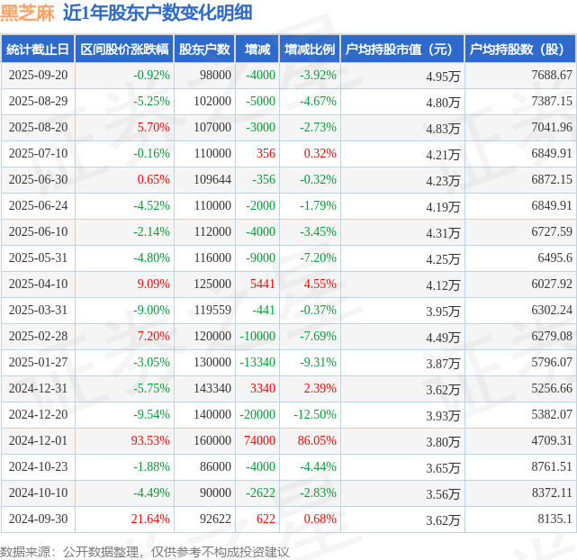 从股价来看,2025年8月29日至2025年9月20日,黑芝麻区间跌幅为0.92%,在此期间股东户数减少4000.0户,减幅为3.92%。