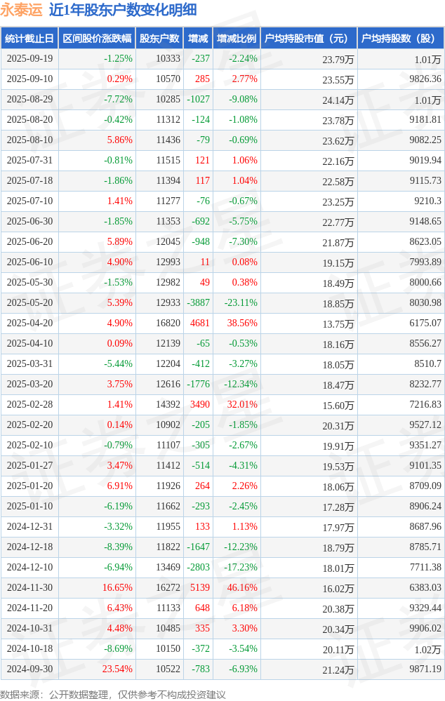 从股价来看,2025年9月10日至2025年9月19日,永泰运区间跌幅为1.25%,在此期间股东户数减少237.0户,减幅为2.24%。