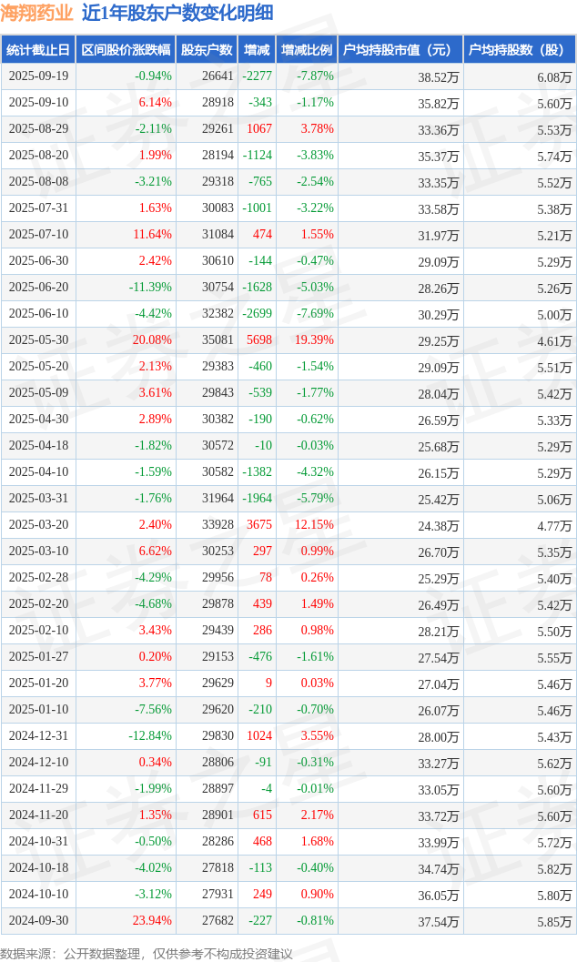 从股价来看,2025年9月10日至2025年9月19日,海翔药业区间跌幅为0.94%,在此期间股东户数减少2277.0户,减幅为7.87%。