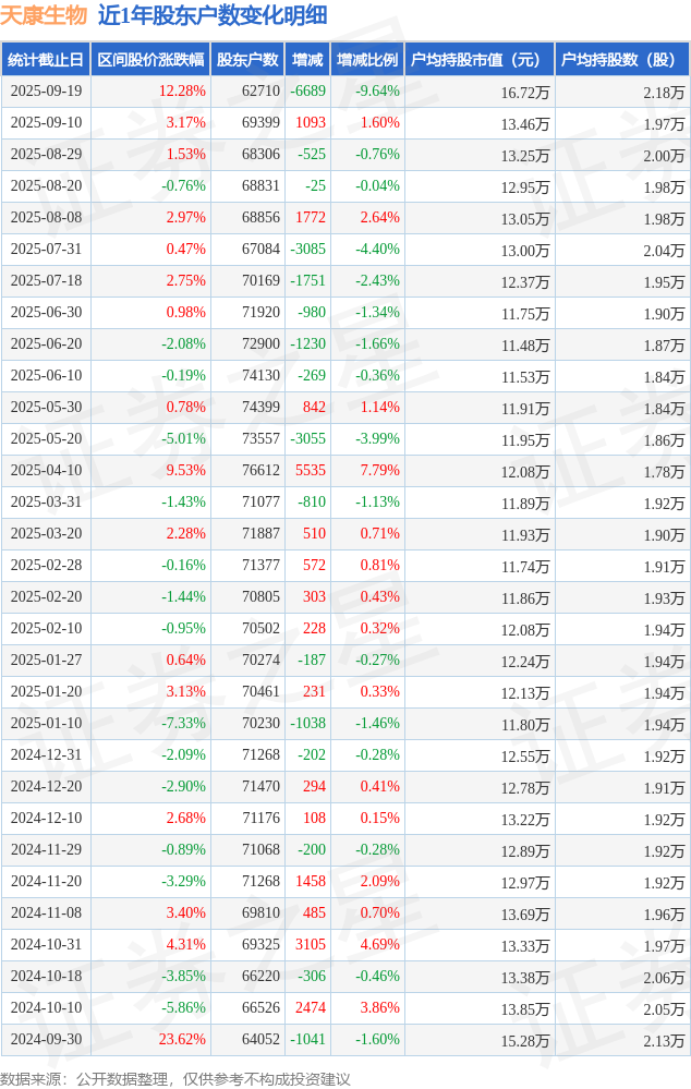 从股价来看,2025年9月10日至2025年9月19日,天康生物区间涨幅为12.28%,在此期间股东户数减少6689.0户,减幅为9.64%。