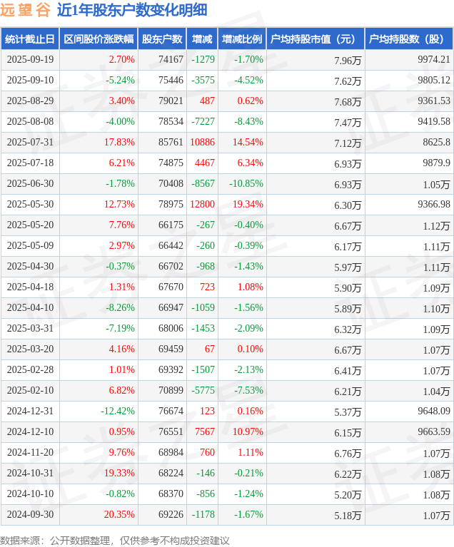 从股价来看,2025年9月10日至2025年9月19日,远 望 谷区间涨幅为2.7%,在此期间股东户数减少1279.0户,减幅为1.7%。