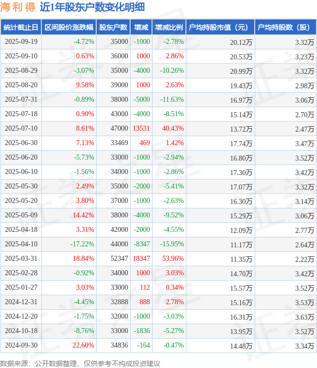 证券之星消息,近日海 利 得披露,截至2025年9月19日公司股东户数为3.5万户,较9月10日减少1000.0户,减幅为2.78%。户均持股数量由上期的3.23万股增加至3.32万股,户均持股市值为20.12万元。