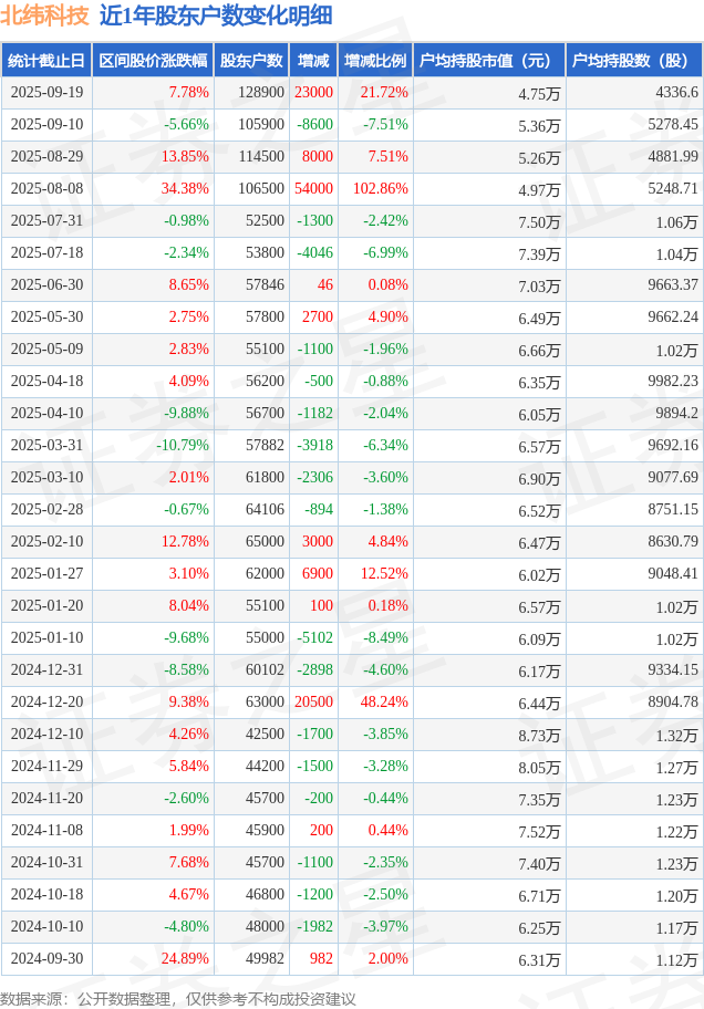 从股价来看,2025年9月10日至2025年9月19日,北纬科技区间涨幅为7.78%,在此期间股东户数增加2.3万户,增幅为21.72%。