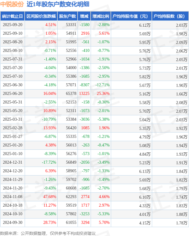从股价来看,2025年9月10日至2025年9月20日,中锐股份区间涨幅为4.51%,在此期间股东户数减少1580.0户,减幅为2.88%。