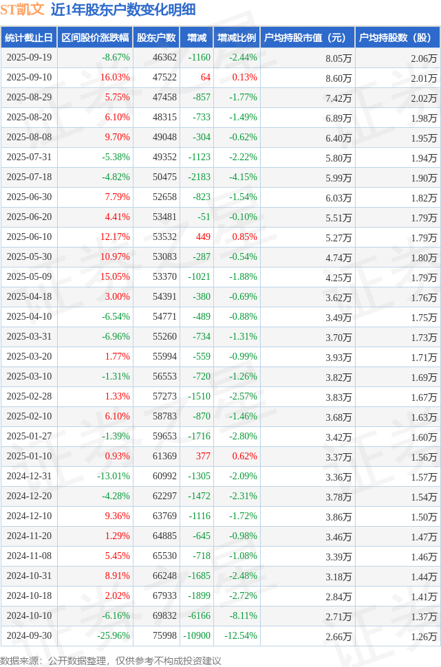 从股价来看,2025年9月10日至2025年9月19日,ST凯文区间跌幅为8.67%,在此期间股东户数减少1160.0户,减幅为2.44%。