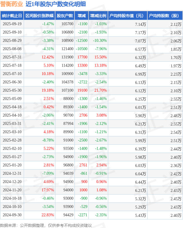 从股价来看,2025年9月10日至2025年9月19日,誉衡药业区间跌幅为1.47%,在此期间股东户数减少1100.0户,减幅为1.03%。