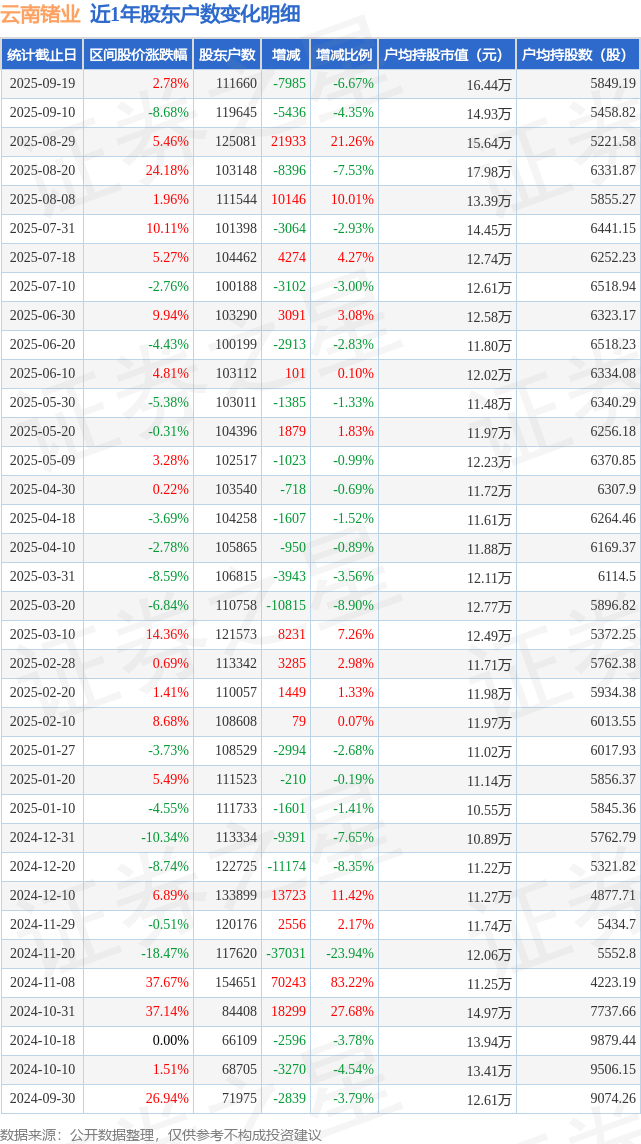 从股价来看,2025年9月10日至2025年9月19日,云南锗业区间涨幅为2.78%,在此期间股东户数减少7985.0户,减幅为6.67%。