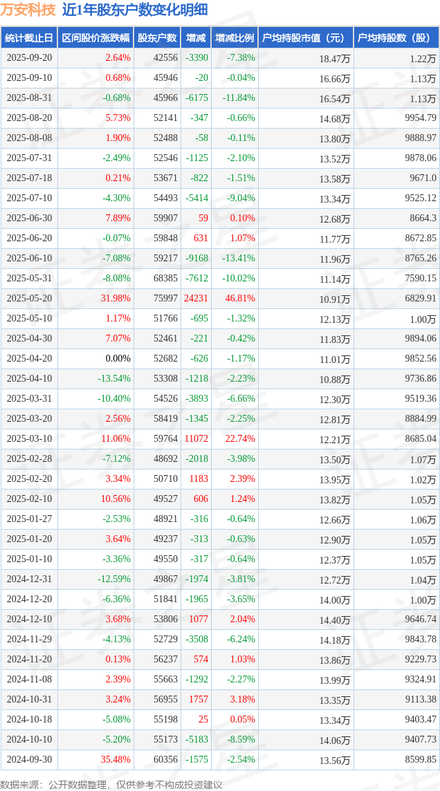 从股价来看,2025年9月10日至2025年9月20日,万安科技区间涨幅为2.64%,在此期间股东户数减少3390.0户,减幅为7.38%。